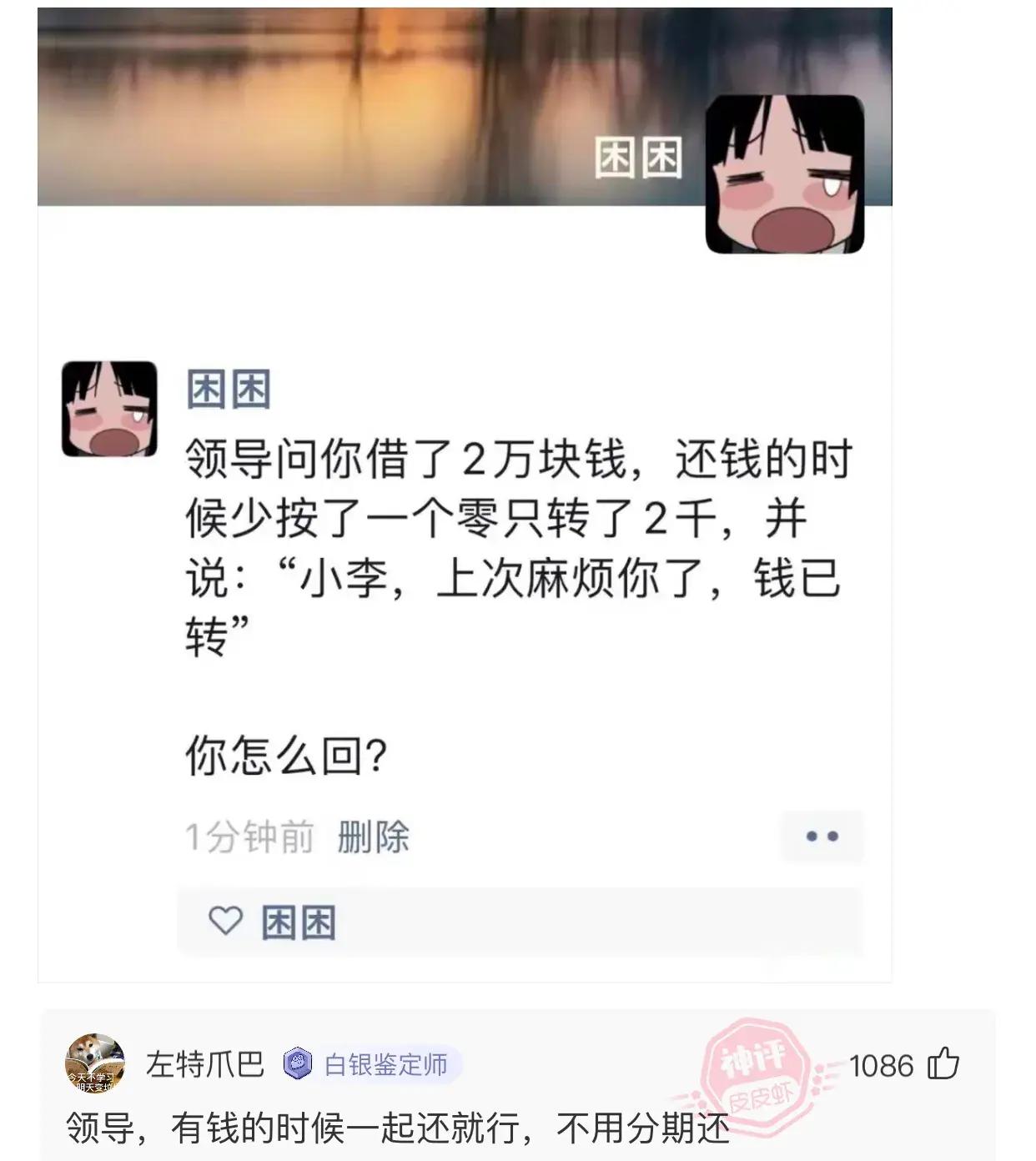 回覆:領導,我記得…上次借錢的時候 給你過臉了 。