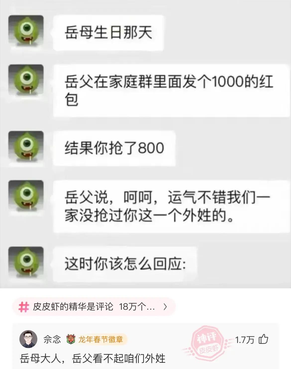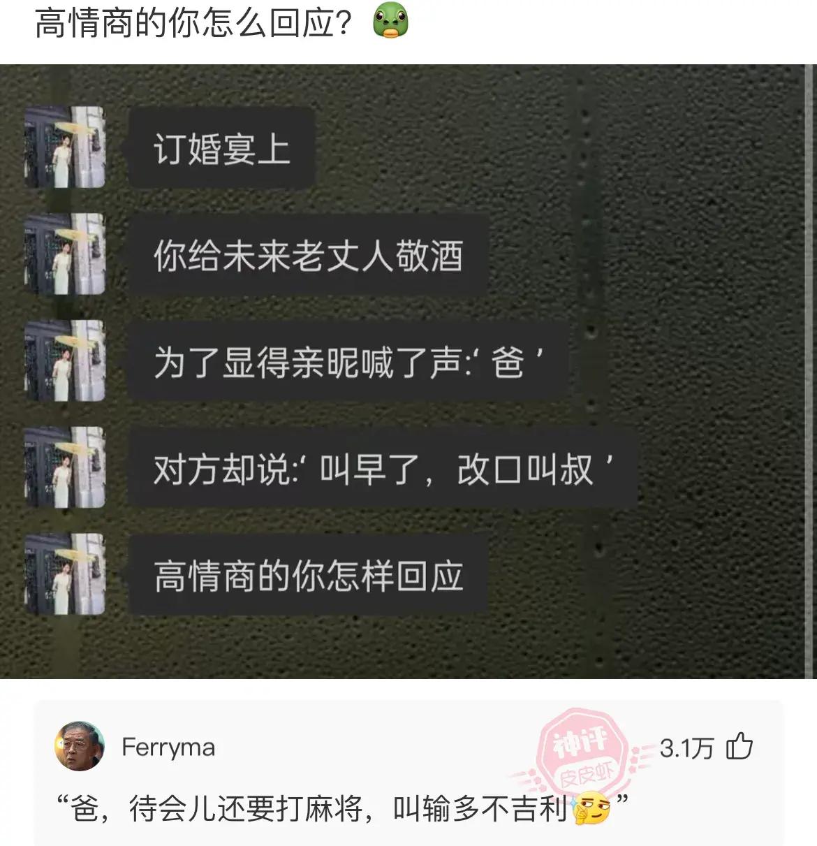 轉頭對媳婦說,這麼重要的場合怎麼不把你爸叫來?