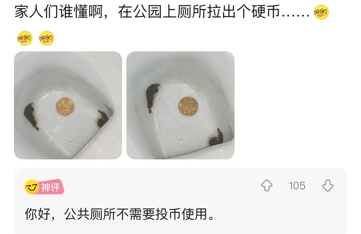 爆笑神評:在公園上廁所拉出個硬幣