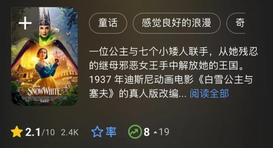 2025年3月21日,迪士尼真人版《白雪公主》全球上映。這部耗資2.7億美元、號稱“顛覆經典”的“百年獻禮”,卻以IMDb 2.1分、豆瓣4.4分的史詩級爛片姿態,刷新了迪士尼真人改編電影的恥辱下限。當魔鏡對着蓋爾·加朵那張“球花級”面孔,面不改色地宣佈“白雪公主更美”時,觀衆終於意識到:迪士尼的魔鏡不僅瞎了,連腦子都進了暴風雪。