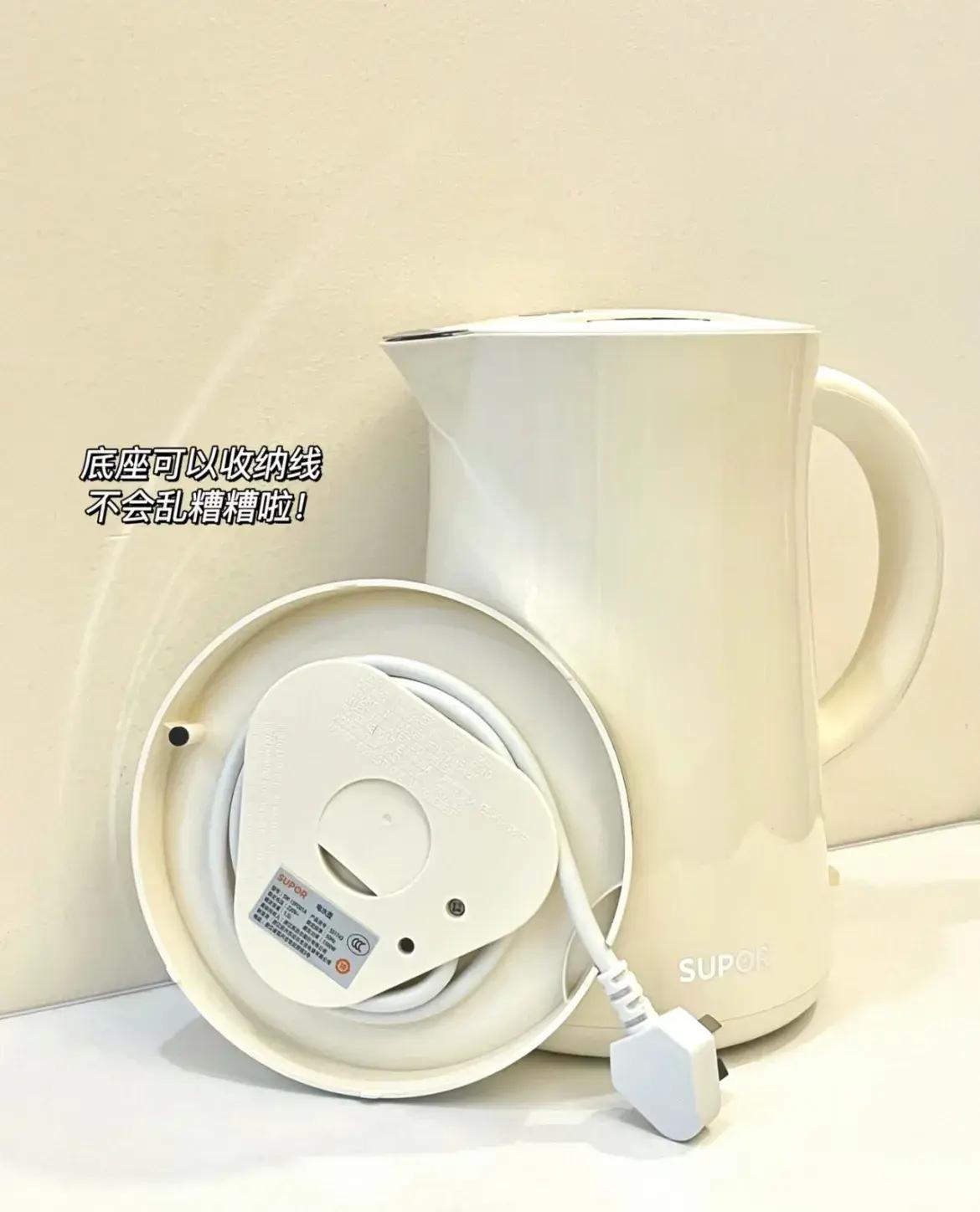 最後,底下帶盤線的好收納,有最大水量標識,防止燒開“吐水”的,出水口有防塵蓋的,是加持。