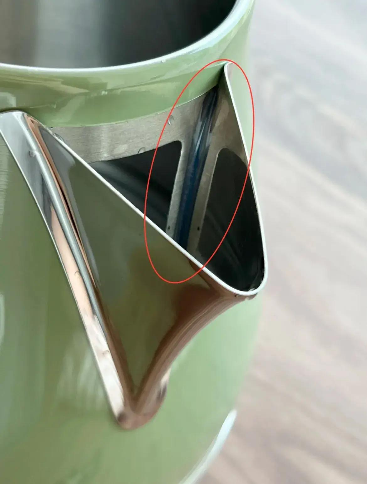 網友@安妮請回答,就選了個超級好看的復古燒水壺,內膽也是不鏽鋼材質,可萬萬沒想到的是,出水處竟然是用膠水粘結上去的。