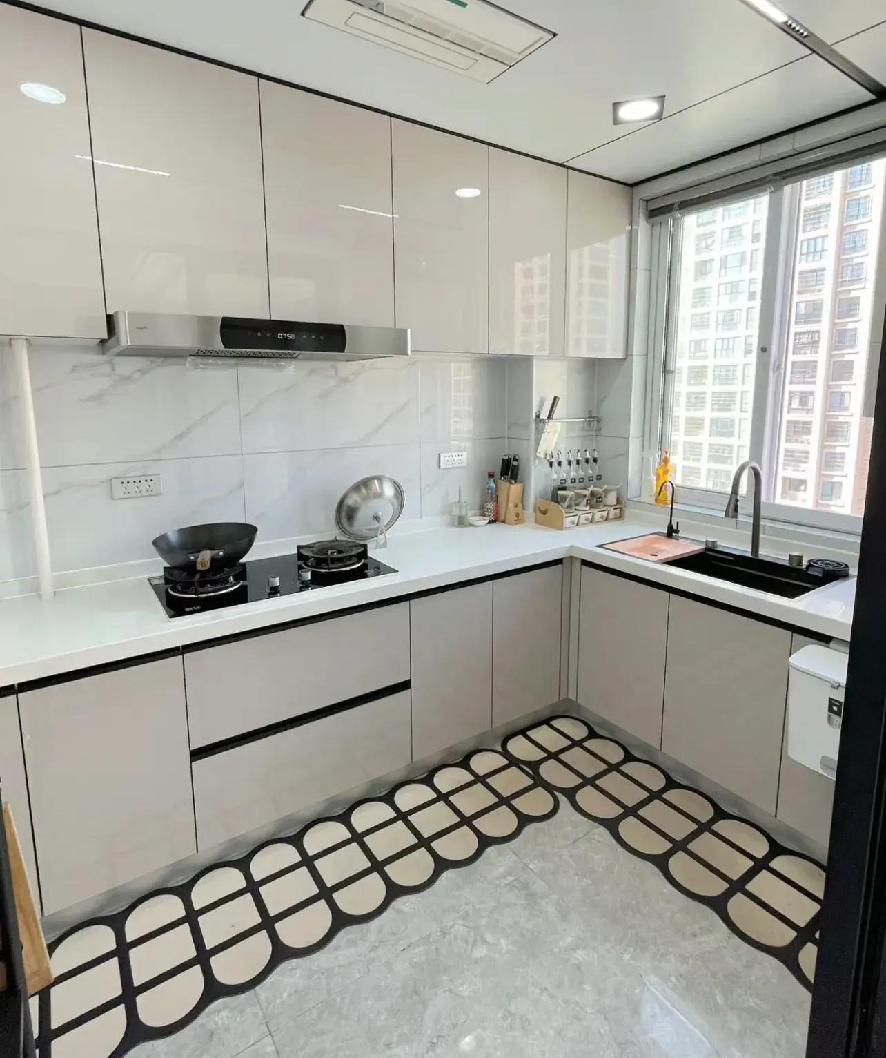 如果客廳是鋪瓷磚,那必然是要通鋪到廚房的。