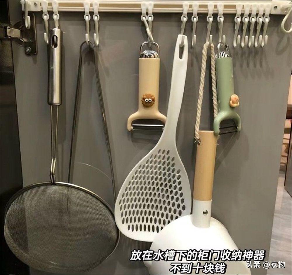櫥櫃的櫃門內,可以用這種活動掛鉤來進一步收納,不僅可以將櫃子裏的縱向空間充分利用起來,又可以恰到好處地收納一些雜七雜八的廚房零碎小物,個人感覺還是實用的。