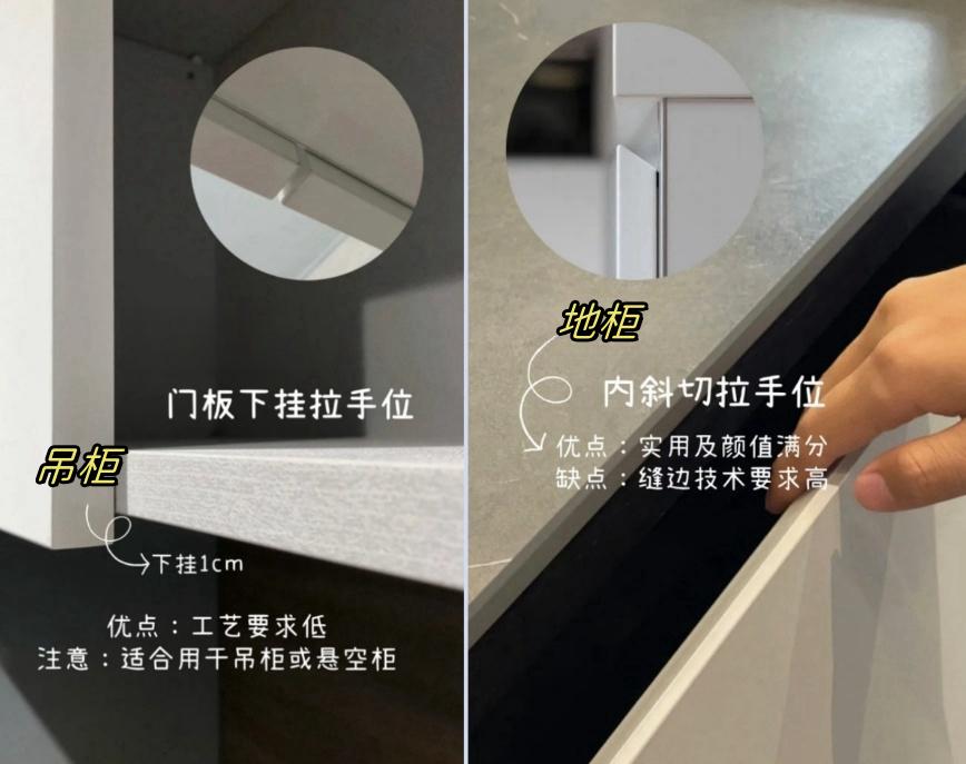 如果堅持選擇“無把手設計”,我倒是建議大家,選擇下面這種“吊櫃下掛1釐米”和“地櫃內斜切45度”的做法。