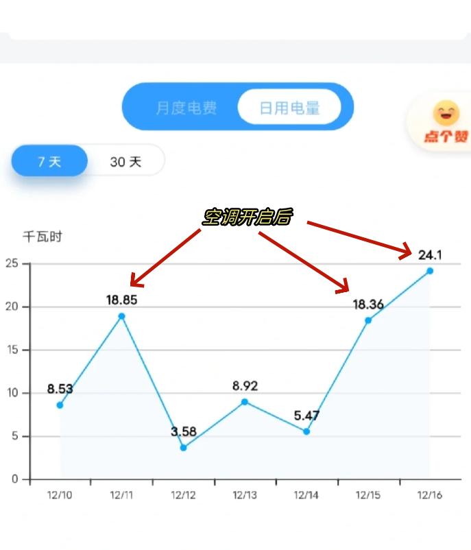 空調的原理基於“熱量搬運”,室內外的溫差越大,意味着需要搬運的熱量越多。因此,也就更加耗電。前段時間,國內氣溫普遍偏低,用空調取暖的家庭,在電費上肯定是要比平常多出不少的。以我的一位粉絲爲例,只要開啓空調,每天電錶基本就沒有低於18度的時候,按照一度0.56元的電價計算,每天電費小10塊。
