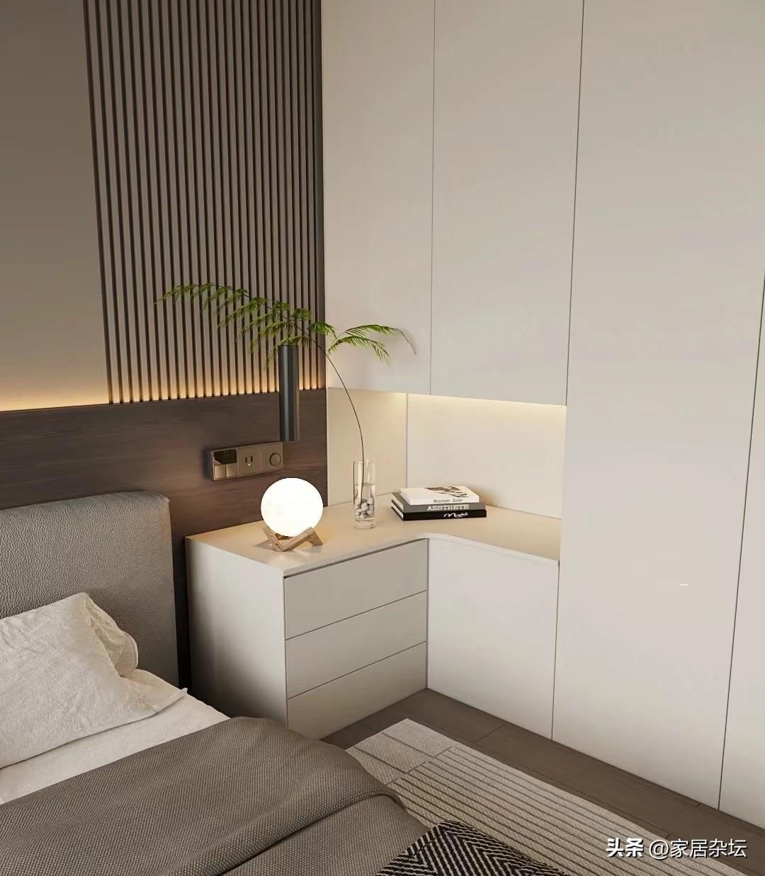 ①、隱藏式牀頭櫃。考慮到牀頭櫃的日常用途,其實可以裝修設計爲簡單的隱藏式的牀頭櫃。例如可以隱藏在衣櫃裏,又或者是摺疊式的。