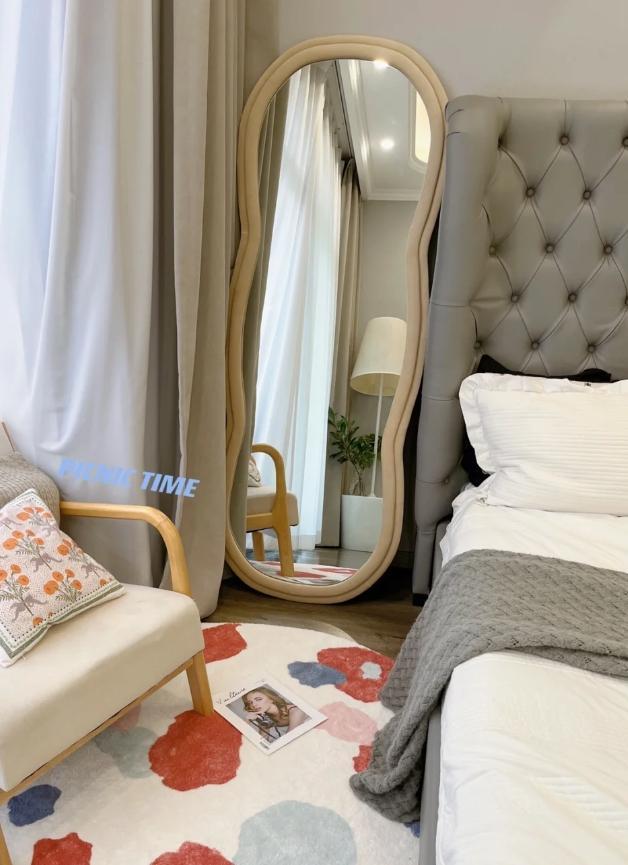 再有就是,類似於下面這種全身鏡,真的不適合直接擺放在地面上,晚上一不小心就會碰到。比較合理的做法是將其直接懸掛在牆上,尤其是適合安裝在室內門的“內側”。這樣既能滿足照鏡子的需求,白天室內門保持開啓,也能擋住鏡子。