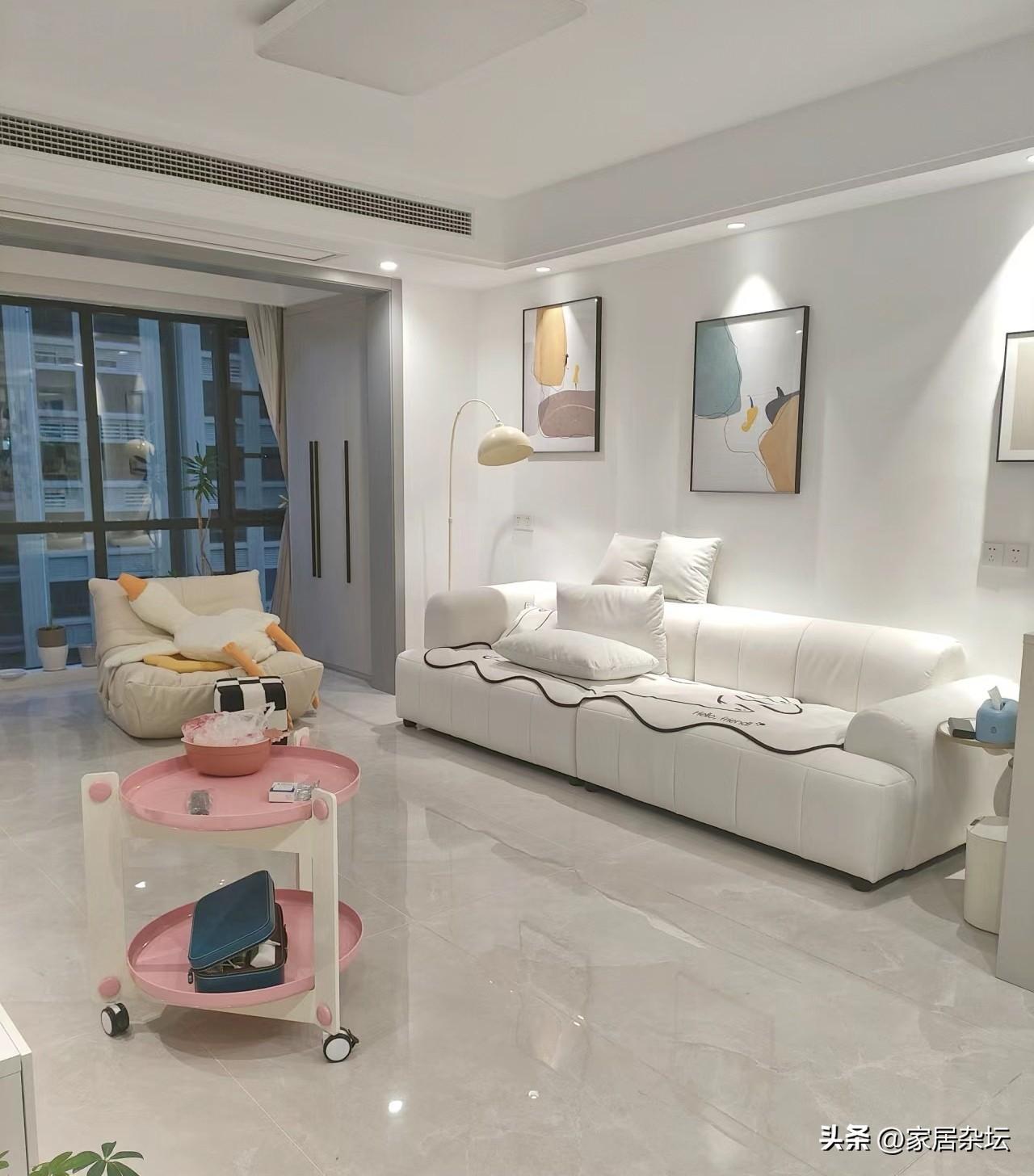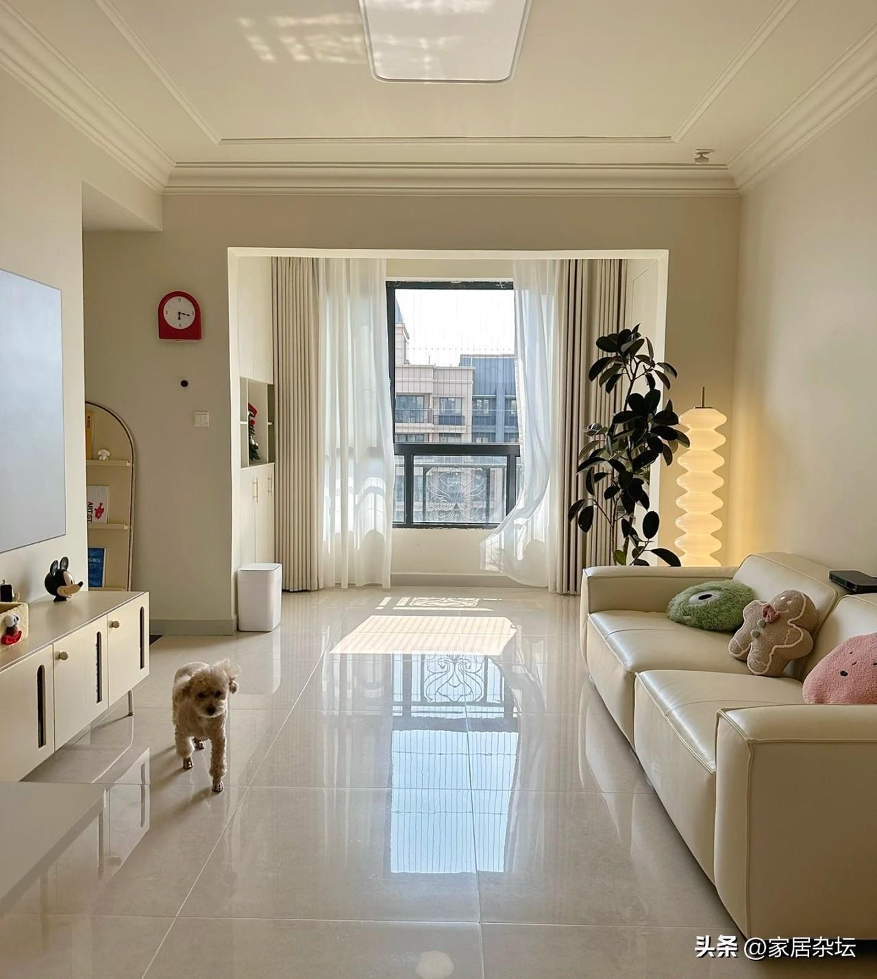 ①、對於幾乎所有戶型的客廳餐廳的地面,都可以選擇白色的瓷磚。白色的瓷磚,儘量選擇紋理特別細的。如果鋪貼的空間比較大,一般要配上波打線。