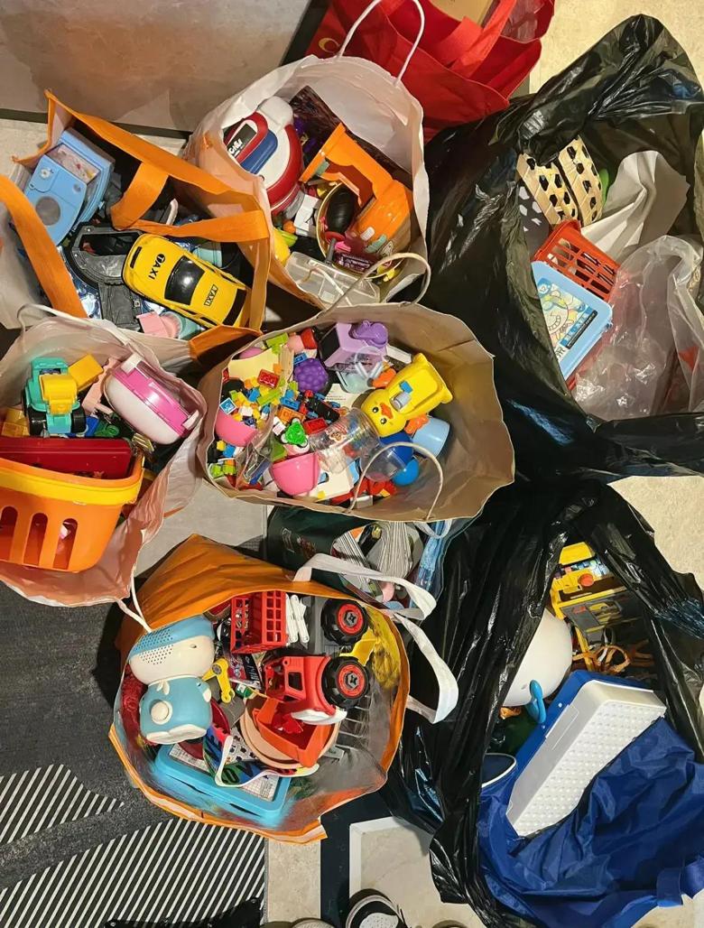 壞了,缺胳膊少腿的直接扔,好着捨不得扔但不玩的,到了週末,讓孩子下樓義賣,或者打包等學校活動義賣、換置等,沒必要一直佔着空間。