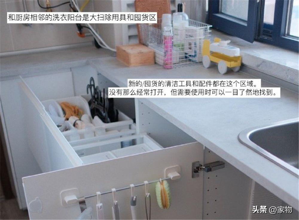 像這間連着洗衣區的廚房,也可以收納一些洗衣囤貨的清潔用品,大部分都存放在櫃子裏,少部分需要放在桌面上的,也要用收納筐統一歸類收納纔行。