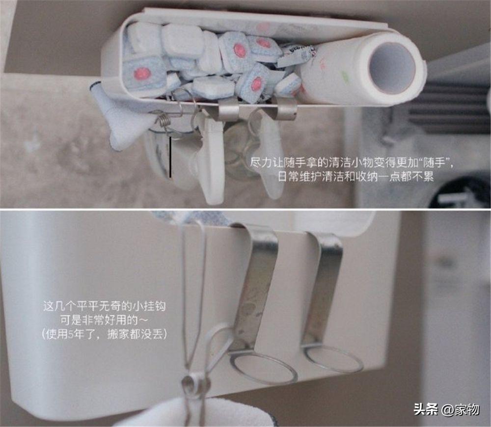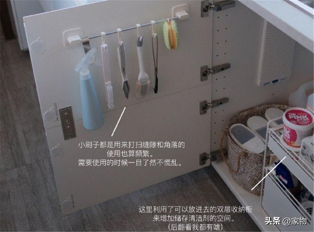 水槽下方我們也是照樣學樣,在櫃門後面安裝小掛鉤,掛置刷子海綿等物,開關櫃門拿取都非常方便,底部的櫃子,也可以充分利用起來進行收納整理。