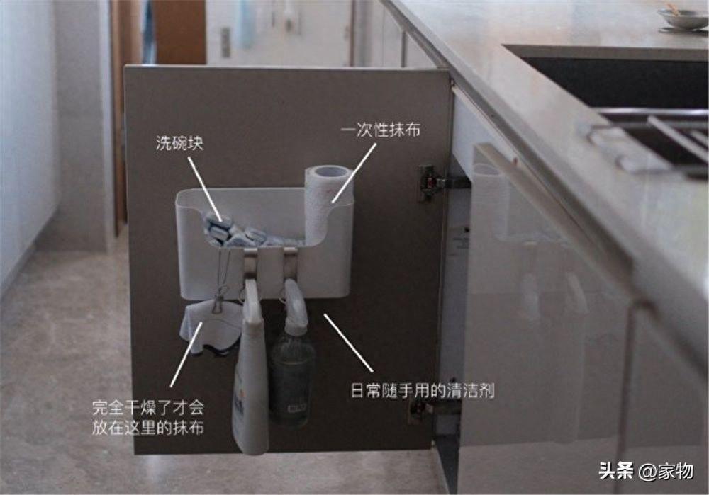 櫃門的背面完全可以掛上收納盒或者是掛架,一次性的抹布、洗碗塊、清潔噴霧等,都可以收納在這裏,這處空間本來是比較雞肋的,但安裝掛架後,就顯得格外實用了。
