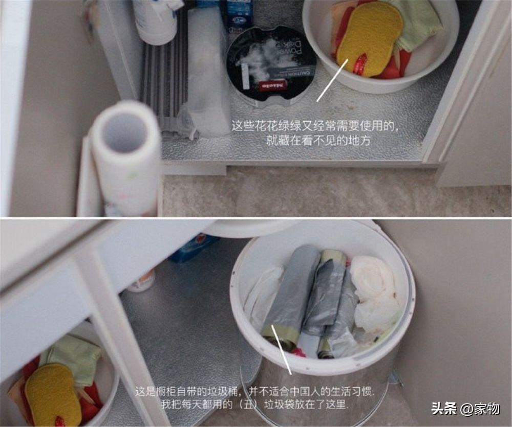 櫃子裏面鋪上防水布,也多了不少收納空間,像是許多鍋碗瓢盆,和色彩各異的清潔用品,都可以藏到底櫃內,櫃子裏藏垃圾桶這點在北方還行,南方的夏天,就不建議大家效仿啦。
