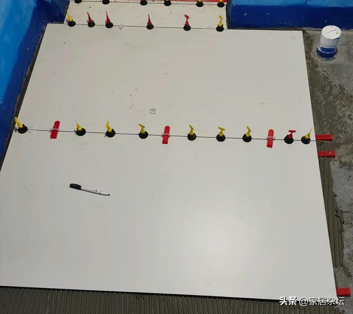 最後,纔是在攤鋪完成的乾性水泥砂漿的表面來幹鋪瓷磚。