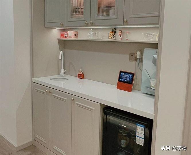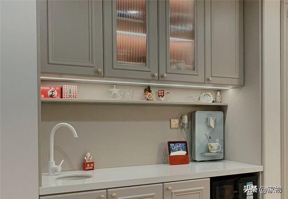 底櫃則主要提供了隱藏收納,只是在一側嵌入了消毒櫃或者說是杯櫃,裏面可以收納咖啡和茶葉等物,櫃子裏隱藏收納了各種各樣的物品後,明面上看着非常乾淨。