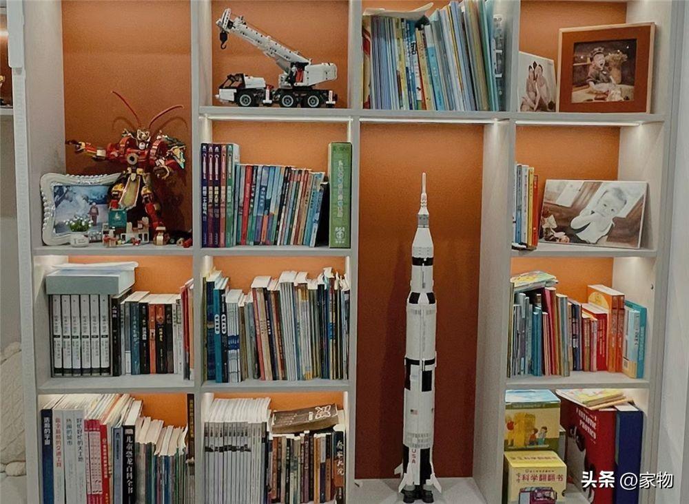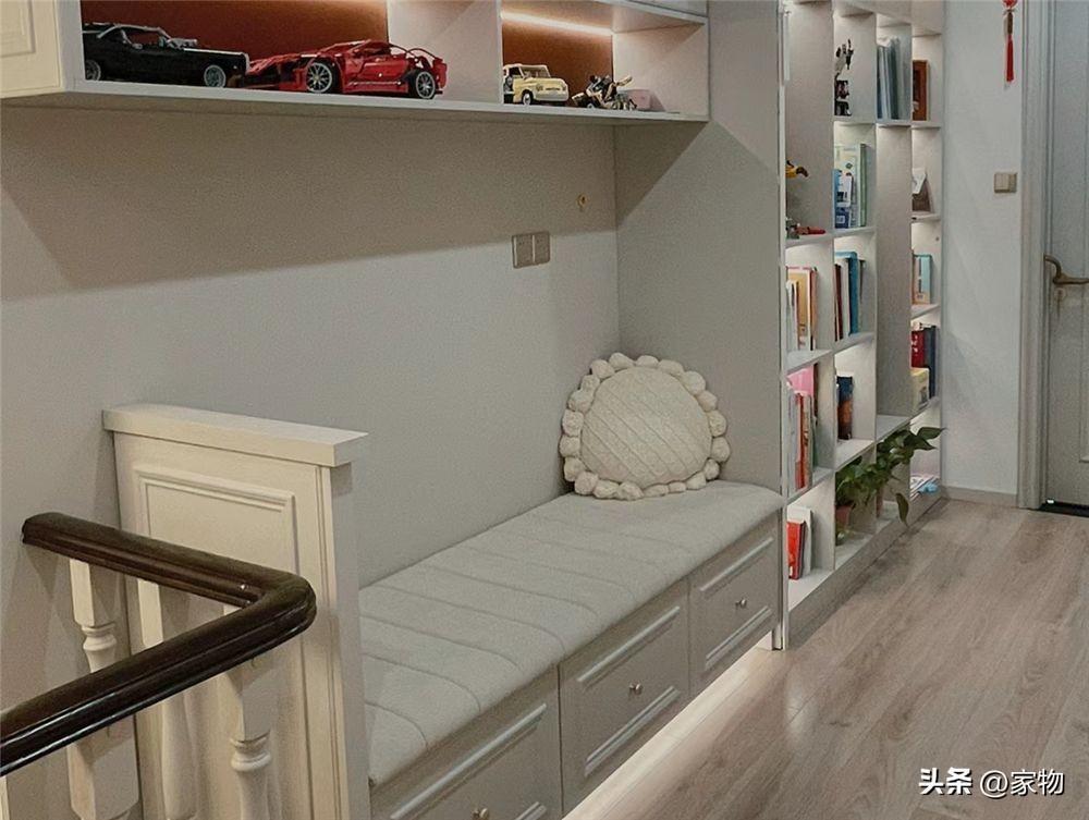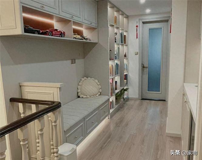 最後,走廊的卡座旁邊,安裝了一組開放式的收納櫃,既有擺件,又有各種各樣的書本雜物,放在卡座旁邊,也算是把這裏變成了一個小小的閱讀角,每寸空間都充分利用了起來。