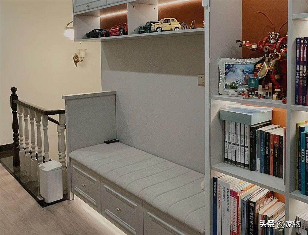 卡座沙發面上增加了一條軟坐墊,底部增加燈光和收納抽屜,頂部做開放式櫃子和收納櫃格,既滿足了展示和收納需求,又有一個相對舒服的坐臥空間,還是挺舒服的。
