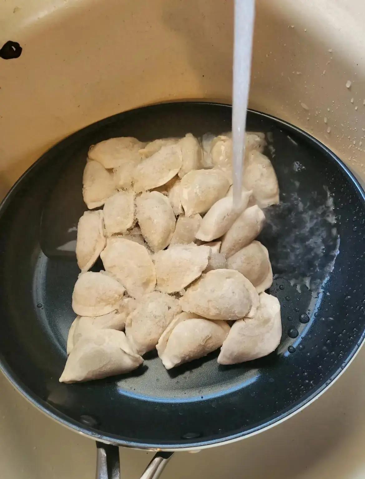 這時,不用衝太久,一半分鐘就夠,補充表面水分,再煮不會裂,而且粘在一起的餃子也會自動散開。