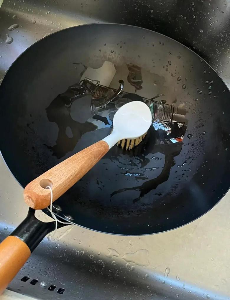 作爲一生愛乾淨的婆婆自然忍不了,於是每次用完的鐵鍋,都會擠一點點洗潔精,然後哪怕是再倒油養。