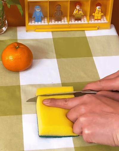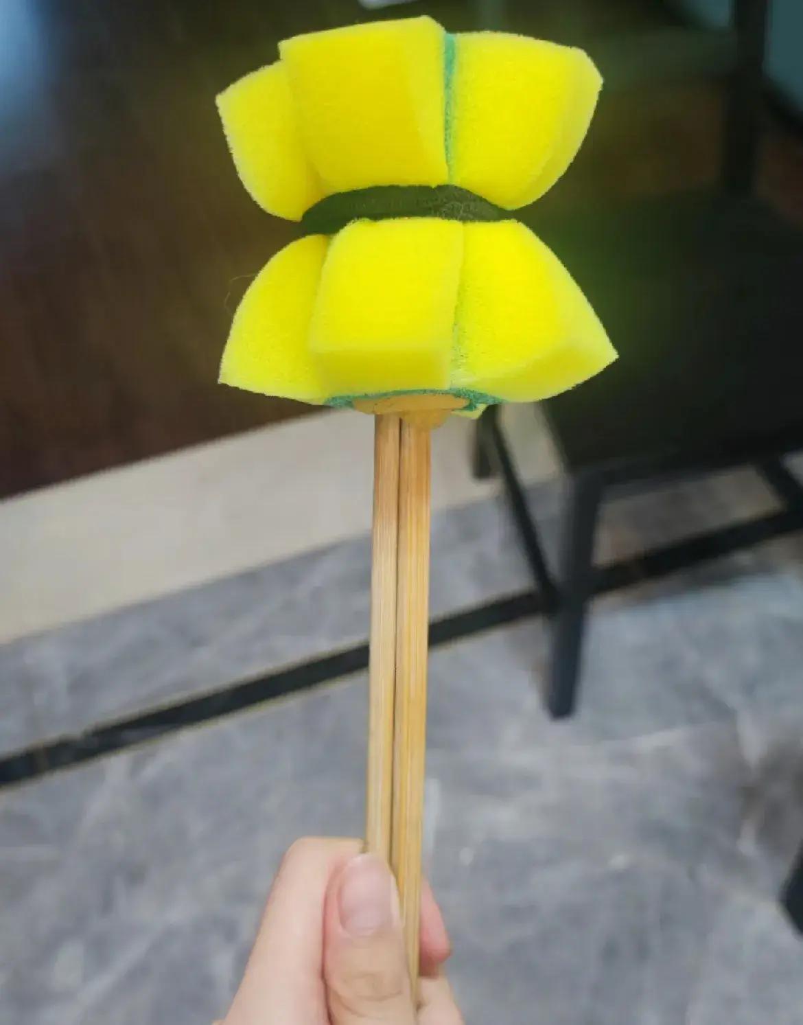 每家都會一次買很多的洗碗棉,從中間等分劃拉三刀,然後折起來,用皮筋或繩子套住,再穿上筷子,就是一個市面上常見的杯刷簡易版本。