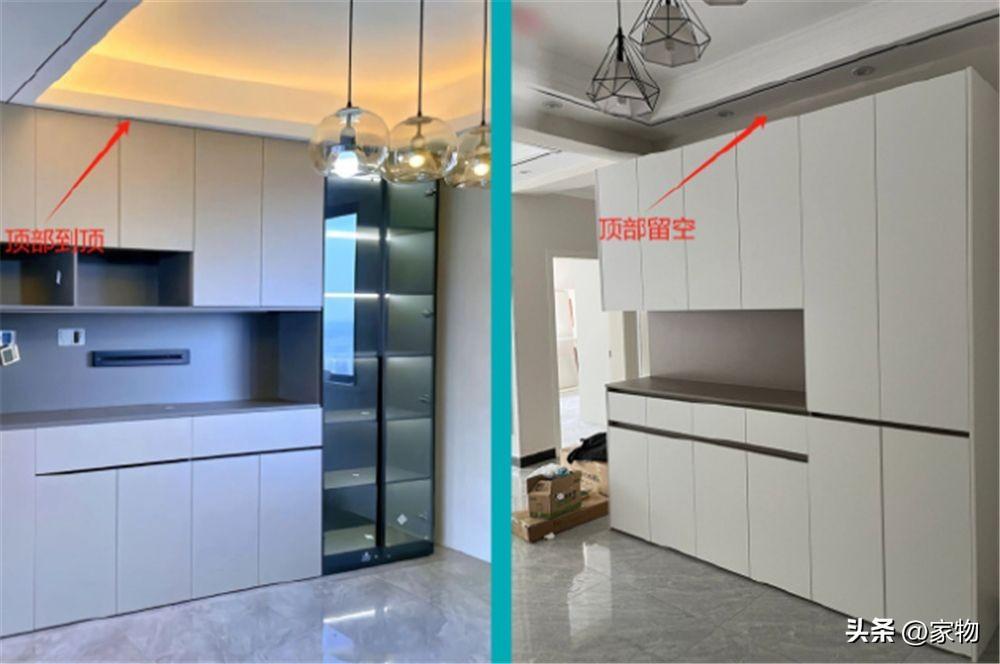 餐邊櫃的頂部也不建議大家留空,留空的頂部很容易積灰落塵,時間長了厚厚一層還不好打掃,如果是我,我會選擇一次性做到頂,好打掃不說,還相當於是多了一部分收納空間呢。
