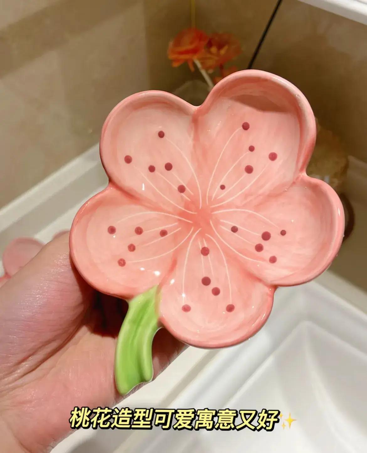 作爲一個香皂盒,桃花的造型可愛,寓意又好,伸出來的葉柄,加上花朵處傾斜的設計,可以把帶進皁盒裏面的肥皂水全部流出。