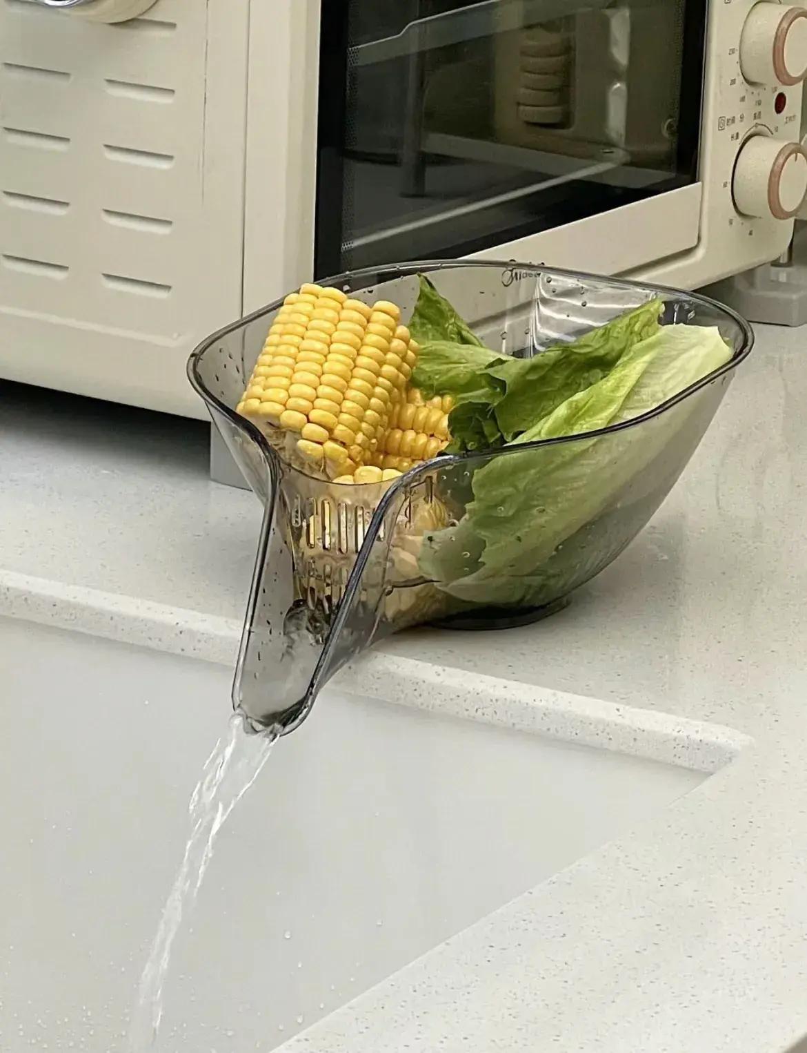 放在水槽周邊,疏水嘴朝向水槽,可以不用動手,自動實現瀝水,同時也避免了用手瀝水,食物從盆邊掉落的問題。