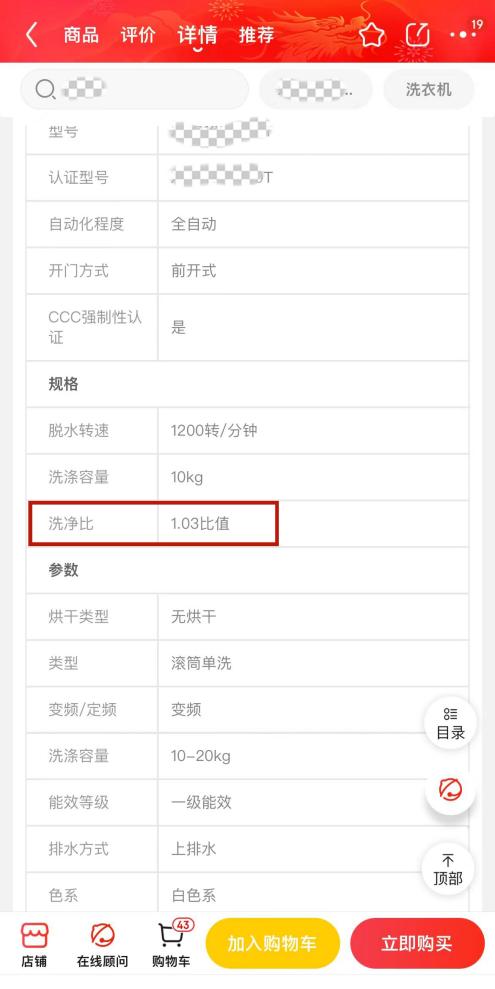這裏面有一套官方規定的洗淨比檢測標準,但有一個數據大家需要注意一下,國家規定的滾筒洗衣機洗淨比最低標準是1.03。我知道了這個標準後,跑去看了一眼我家那臺用了好多年的滾筒洗衣機,真的是兩眼一抹黑,自己當個寶用了這麼久的洗衣機,只能剛剛夠到國家最低標準。難怪有時候洗白襯衫,拿出洗衣機的時候看不出來,穿的時候才發現一些不是很明顯的污漬沒有被洗乾淨。不僅如此,跑去各大電商平臺上一看,排名靠前的洗烘產品,有許多都是在這個標準線上徘徊。