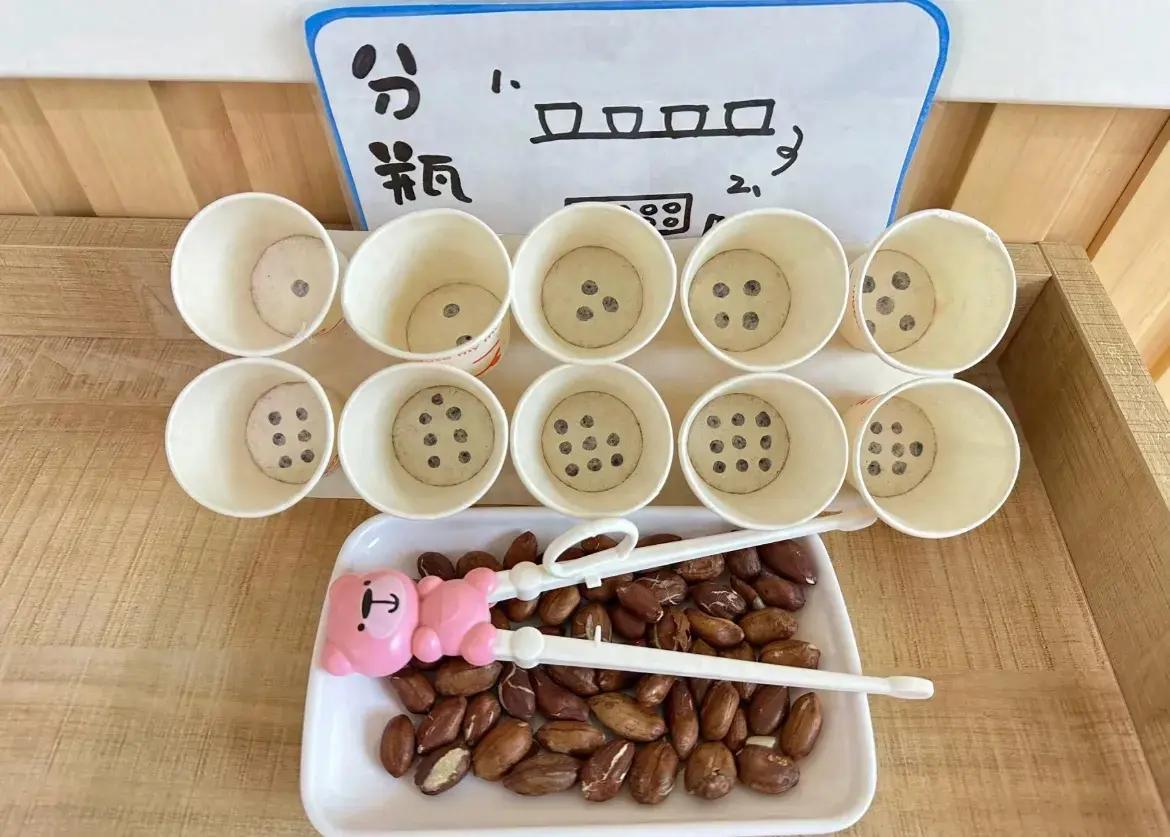 用過的一次性杯子,塗上不同的點數,再準備點豆子,準備個筷子。