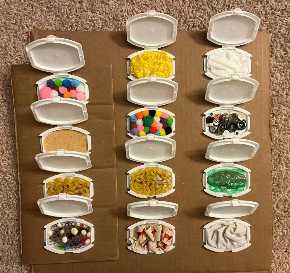 找個紙板,貼上溼巾盒蓋,然後給蓋子塞點不同觸感的東西。