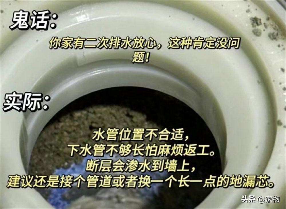 排水有斷層,常常是因爲地漏太短或者水管不夠長,這會導致後期出現牆面返潮問題,遇到這種情況,裝修師傅常常會說是二次排水沒關係,但你真的要堅持讓他們換地漏或者是改管道,否則後面都是問題。