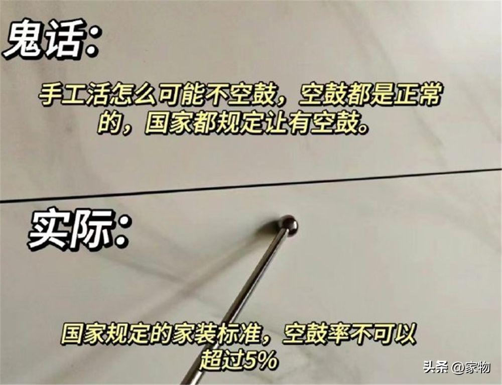 貼完磚,即便不找監理來查空鼓,自己也要對每一塊瓷磚的空鼓進行檢查,有很多貼磚師傅由於馬虎和手藝不佳,讓瓷磚出現了大片空鼓,這些日後都容易掉落,但實際上,國家規定的空鼓率不如5%,如果超過,就是實打實不合格。