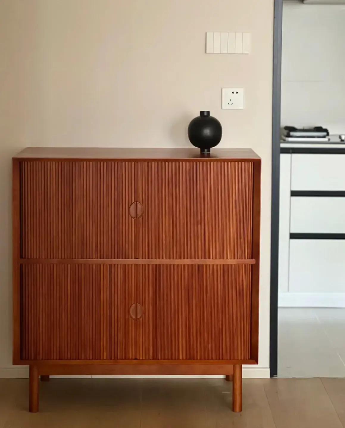 其二是:像我們收納化妝品、文件等小物件,往往需要很多分格。如果用抽屜,就會有很多小格子,對於喜歡簡潔利落的人來說,並不友好,可如果用捲簾門,直接把裏面的抽屜,給蓋住,那就友好多了。