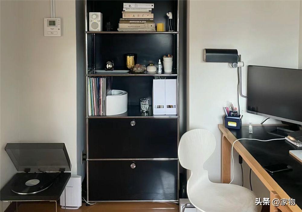 底部的兩格收納格,可以隱藏收納各種各樣的雜物,放在裏面收納也剛好合適,黑色的櫃子與黑色的桌子相搭配,既起到呼應作用,又爲室內空間起到了點綴的作用。