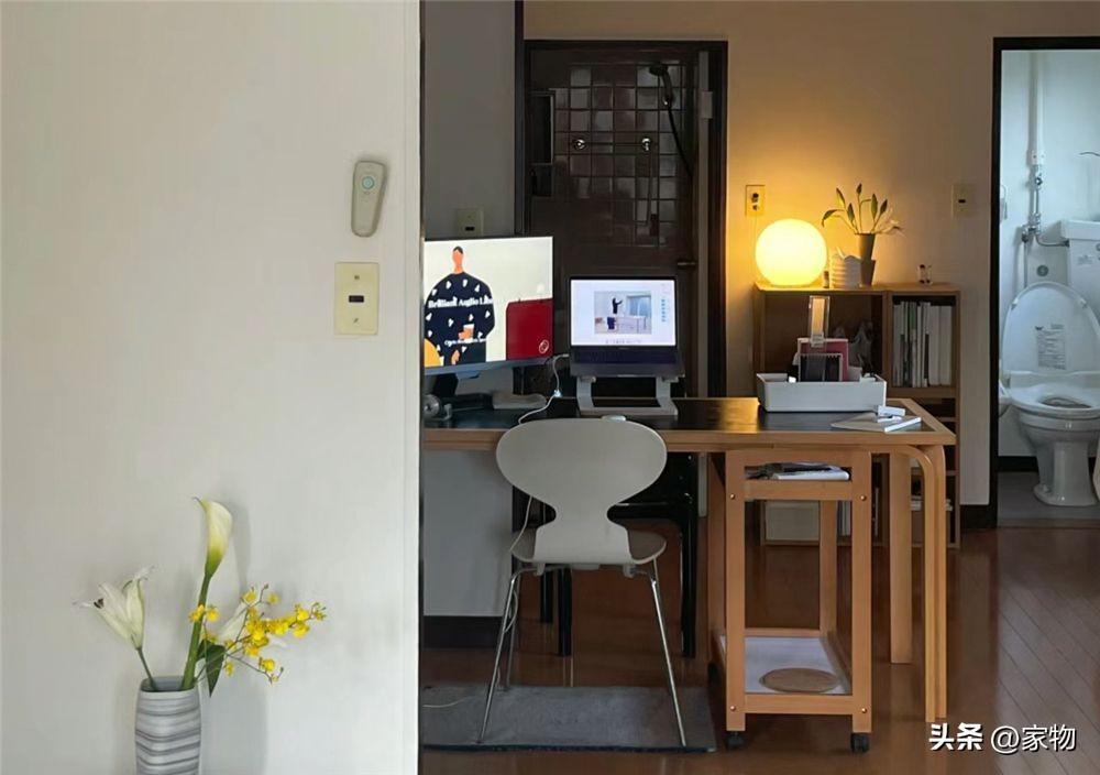 這個一室一廳的小家,空間內沒有太多隔斷,大多都是做成了開放式的格局,家裏中心區域是一張辦公桌,它同時也是餐桌和客廳的桌子,一起來看看~
