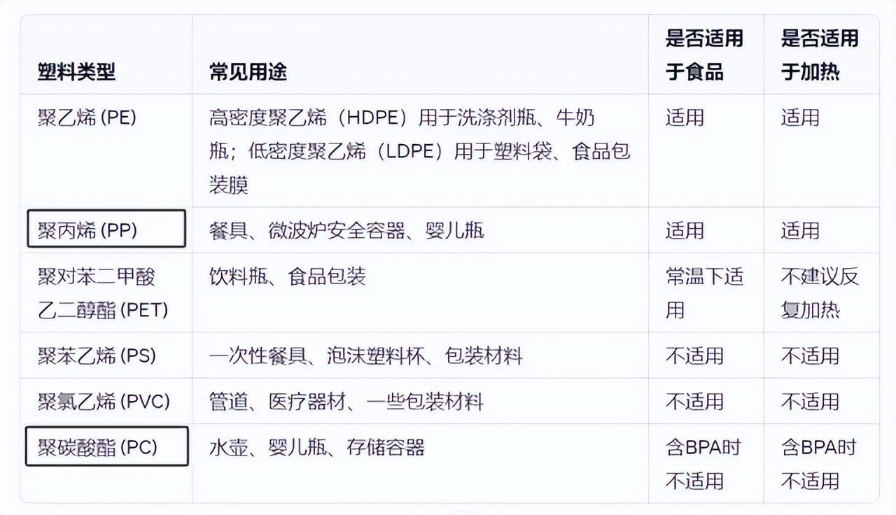 上面我用黑線標出來的“聚丙烯(PP)”,屬於最爲安全的一種塑料材質,基本是可以放心使用的。所以不管是餐具還是嬰兒奶瓶,只要註明了“PP”,就可以放心投入。