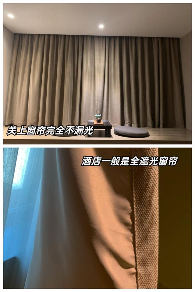 幾乎絕大多數的酒店裝修,都會採用窗簾盒的設計+較厚的遮光簾,也就是說在關閉窗簾的情況下,房間裏不開燈幾乎是全黑無光的,基本能做到100%的遮光效果,私密性會更好,更容易進入深度睡眠,第二天也不會被刺眼的陽光“叫醒”。