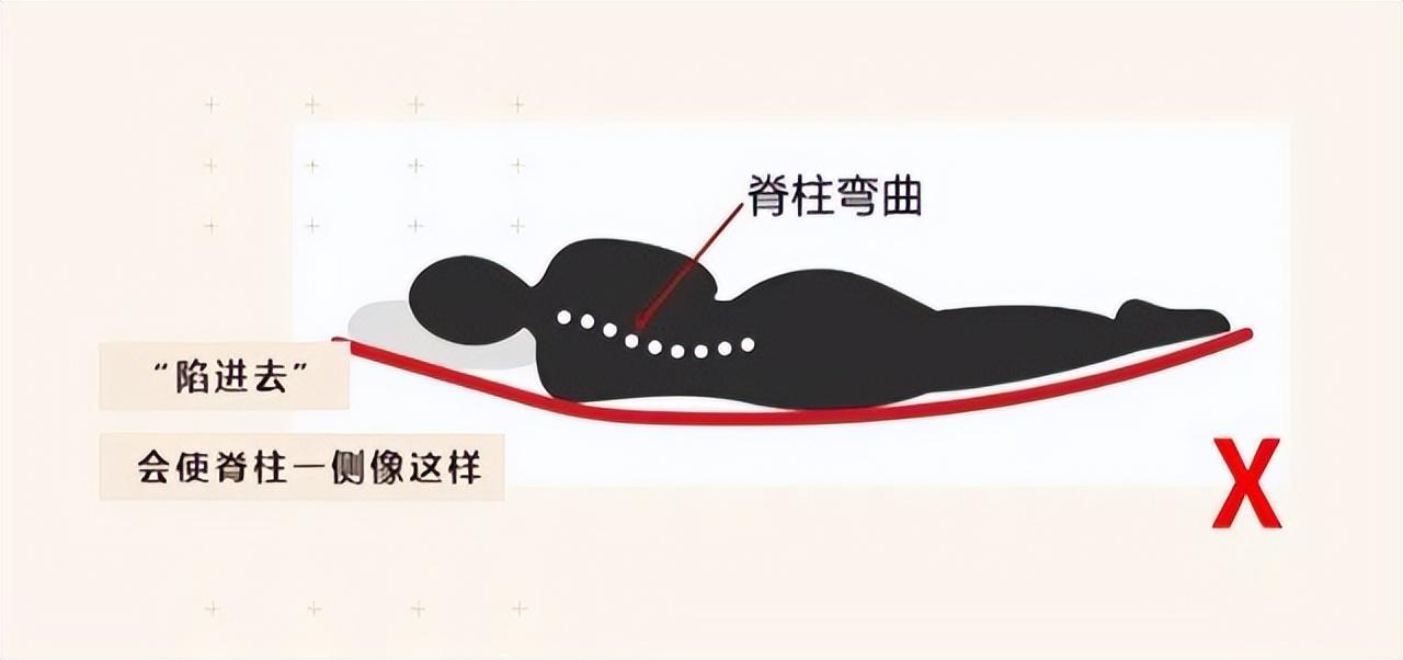 首先是脊柱問題,軟牀墊換而言之,就是支撐力弱一些,剛躺下去的時候會覺得特別舒服,因爲貼合感很強,但實際上這個時候咱們人躺在牀上時身體的脊柱彎曲是不健康的,如下圖所示。