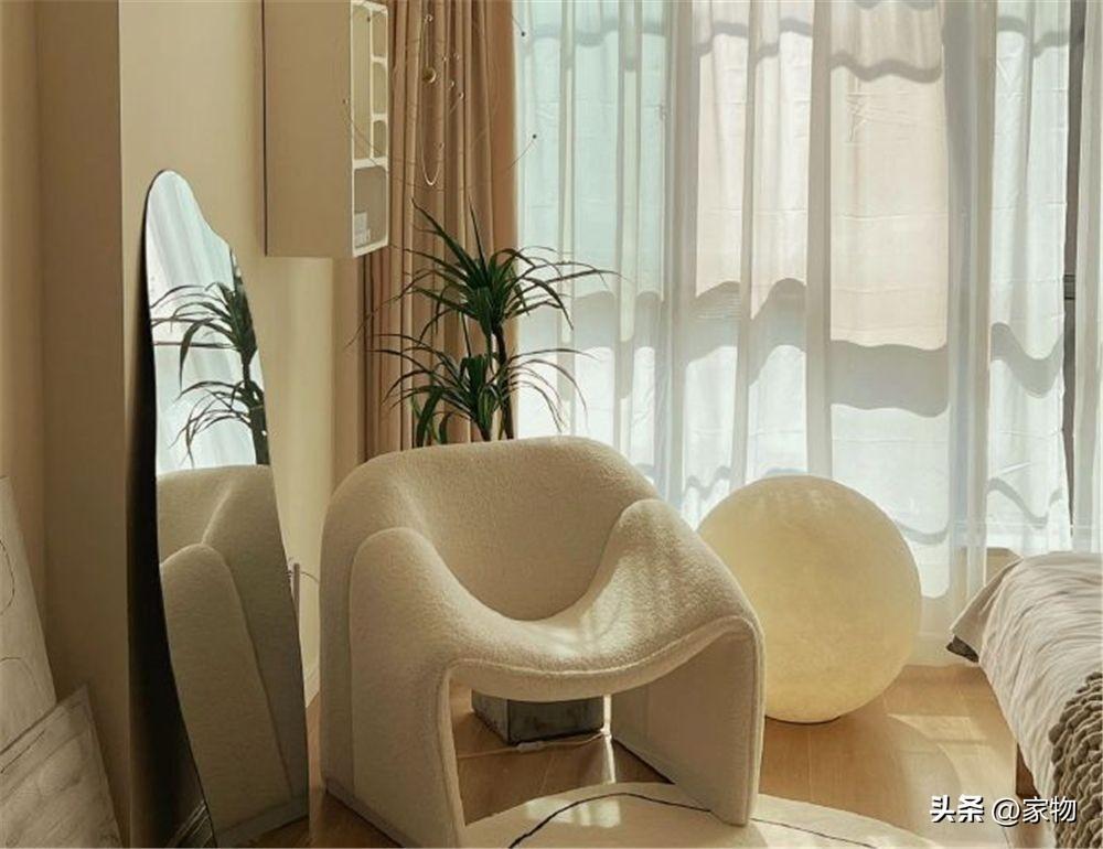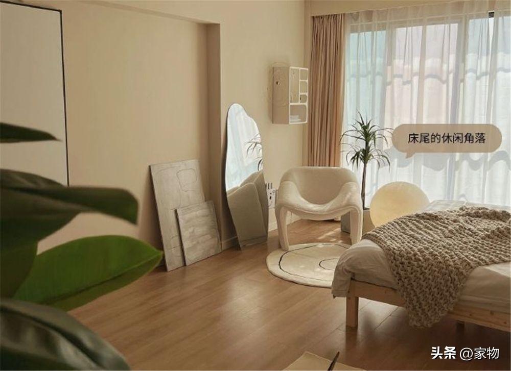 牀尾的部分也並沒有閒着,有很大一塊空餘留給了休閒角,它離陽臺很近,離落地窗也很近,天氣晴好的時候,拉上紗簾,陽光透過簾子照到這個小角落裏,窩在單人椅上睡睡覺、吹吹風,都很舒服。