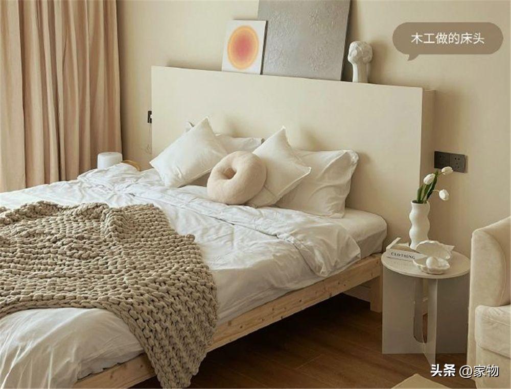 臥室的位置是一開始就規劃好的,做了一個造型牀頭,並擺放上雙人牀的牀架,一個人住,也要有足夠寬敞和舒服的睡眠區,這對於小戶型來說反而是更爲重要的,畢竟在家時,最長時間還是躺在牀上的。