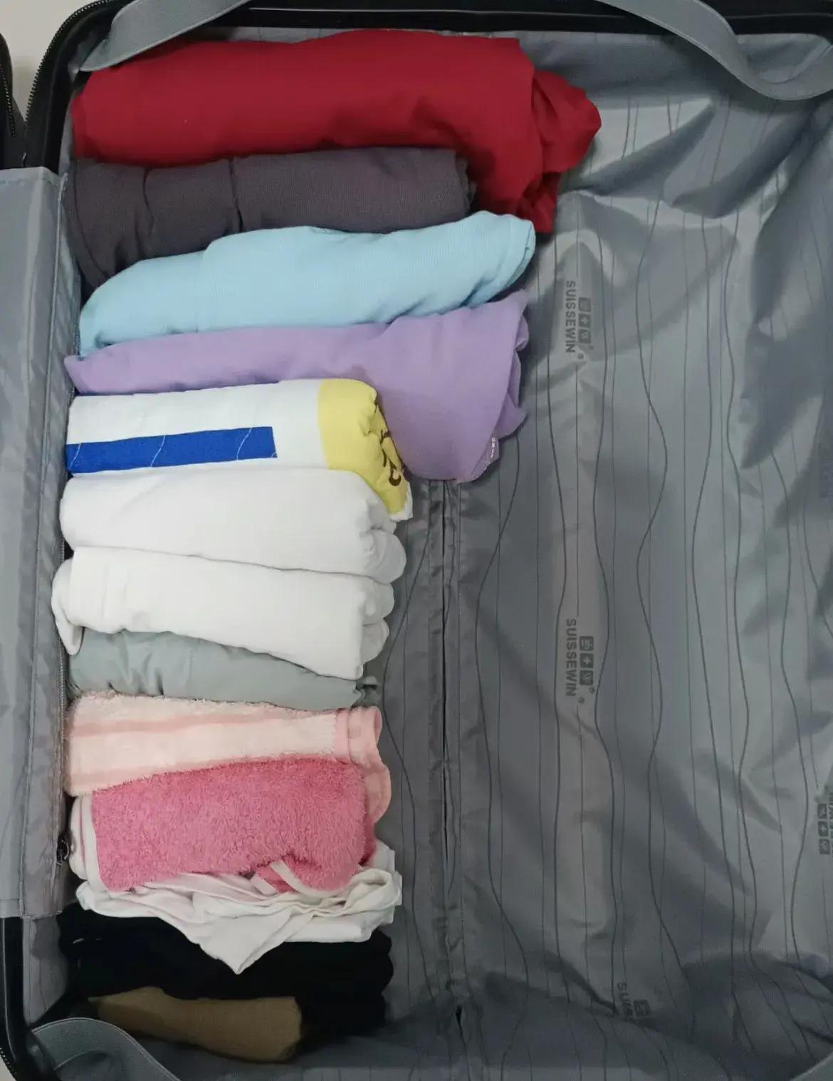 根據行李箱的厚度,把衣服疊成合適的寬度,豎着擺進去,全部裝好,比之前層層落至少富足出四分之一的空間,多裝一雙鞋子不是問題。
