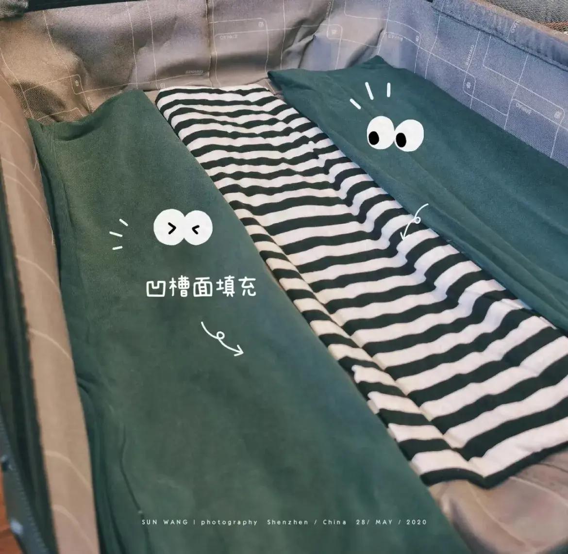 那麼這時,彆着急一通塞,先用薄的打底衫、T恤等,把凹槽填滿,能避免空間浪費,而且按厚度,少則容納三件,多則容納五六件不成問題。
