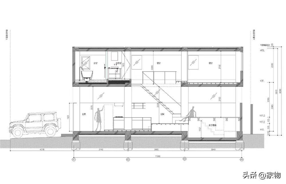 先說說這個小家的戶型圖,它和很多日本的房屋一樣都臨街,從車庫進來後就是一間與廚房相融的客廳,再往裏走則是間客廳,窗戶雖高,卻能將光線帶入家中。