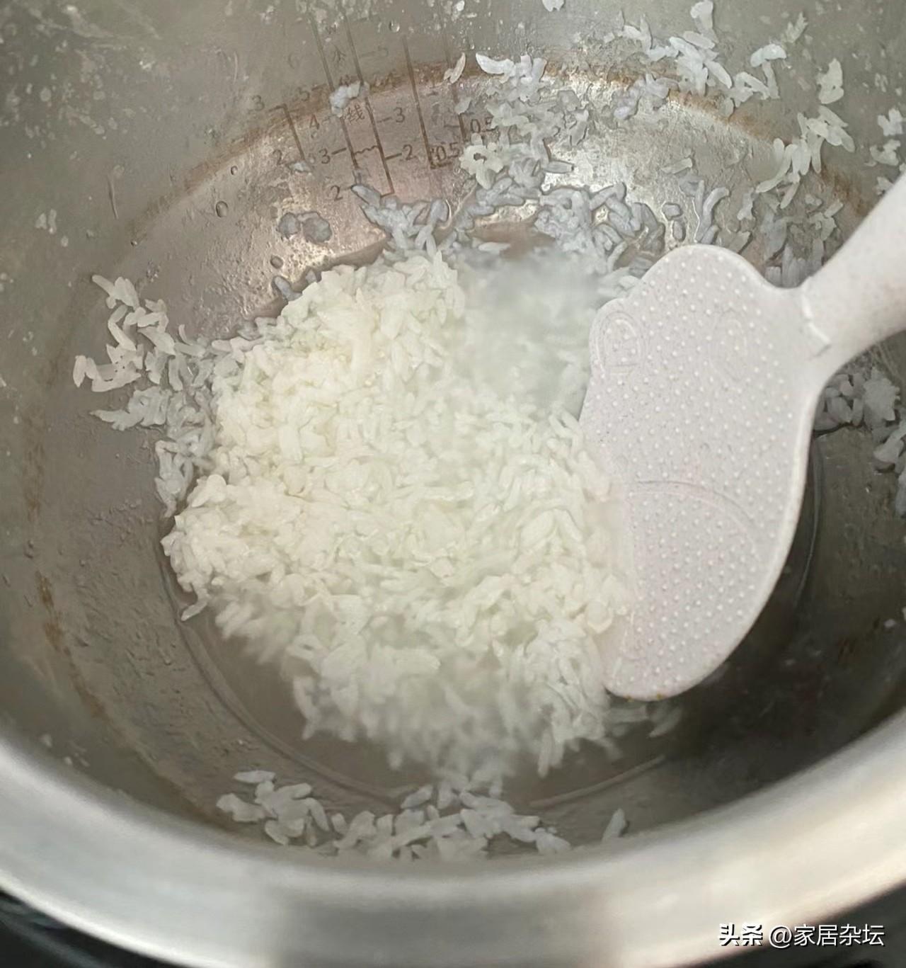 ②、表層的一層米,特別容易幹。其實這層米飯,確實已經熟了,但是由於失去水分,導致變得乾硬而不好喫。