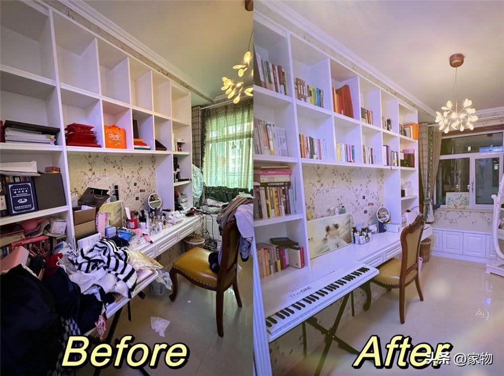 書房的櫃子做得不少,但因爲是開放式的,又沒有充分利用起來,所以也堆滿了雜物,看起來亂糟糟的,這次收納整理,將書本和雜物都妥善收納到了櫃子裏後,看起來就利落了很多。