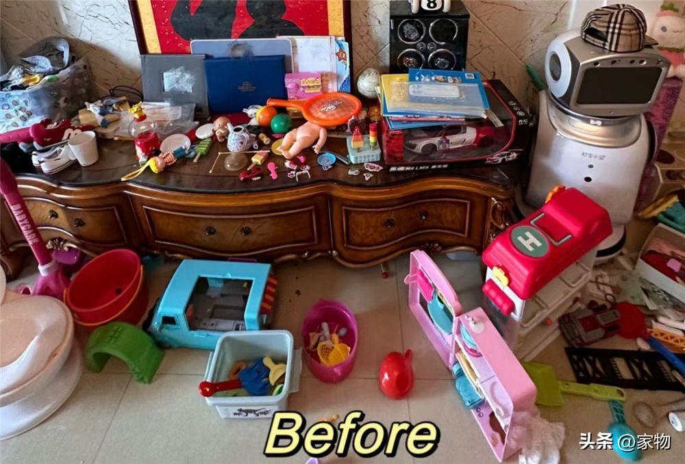 客廳收拾之前,真的是亂七八糟一大片,尤其是兩位整理師將孩子用的東西也歸類取出放到一起的時候,客廳內的雜物簡直多到了一種難以下腳的地步。