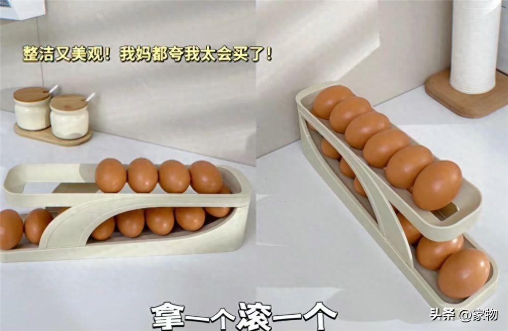 雞蛋的收納,之前我都是放在冰箱的一個抽屜裏,方便但不整齊,看到了這種自動滾下來的蛋託就想買一個試試。