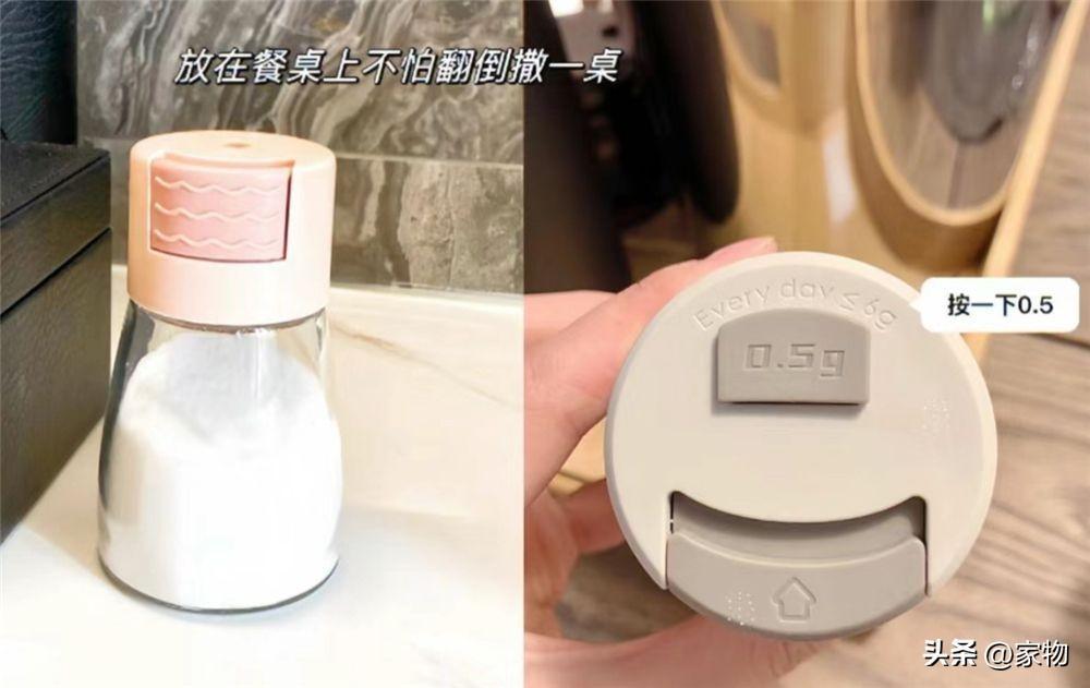 這種鹽罐大家都見過沒?它其實是有些問題的,看似一次出0.5克的鹽能定量,但放到有熱氣的鍋具上面,就會融化掉鹽堵塞出鹽口,久而久之也就沒那麼好用了。