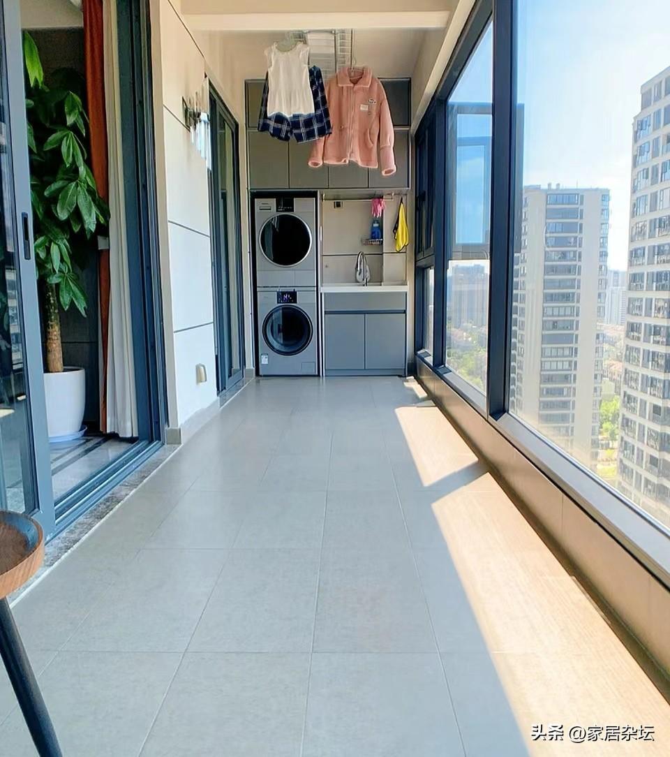 ①、在陽臺洗衣區配備了烘乾機。如果我們陽臺有洗衣機,那麼在洗衣機旁邊再專門配一臺烘乾機,這樣可以配套使用。